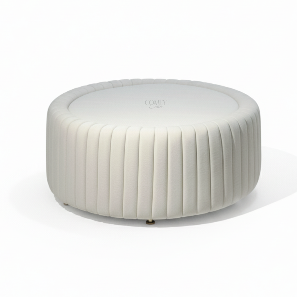 The name “Yaqouta”, derived from Arabic meaning white gem or precious crystal, captures the table’s refined grace and sculptural beauty. Wrapped in velvety upholstery with vertical fluting, Yaqouta radiates serenity and sophistication. Its seamless round form and cushioned top make it versatile — equally perfect as a centerpiece, ottoman, or conversation accent in modern luxury interiors.